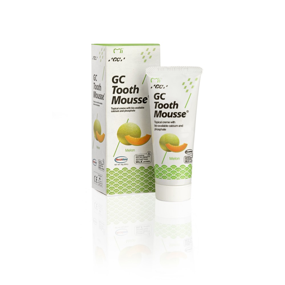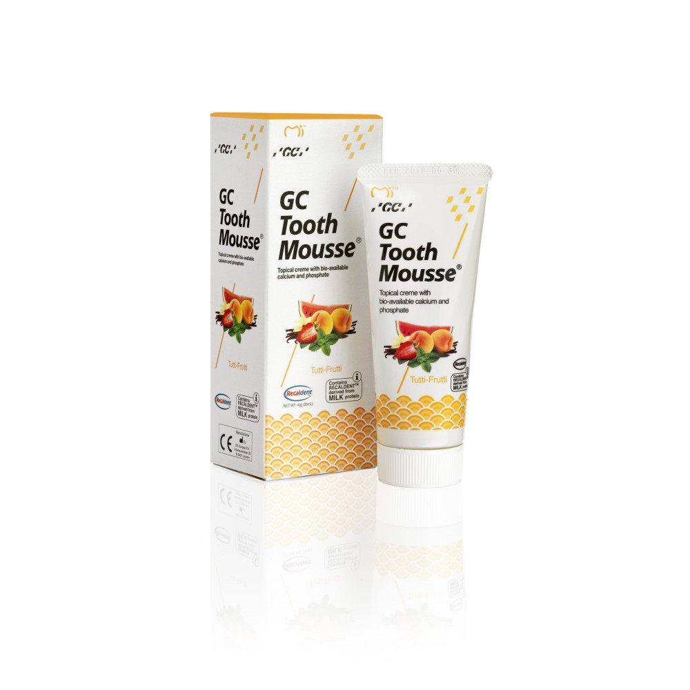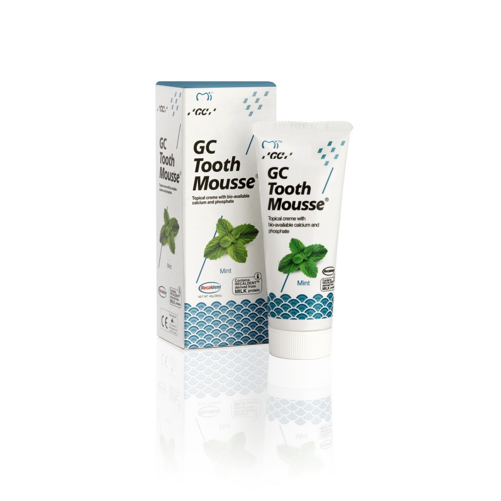 Tooth Mousse de la GC este o crema topica pe baza de apa, fara zahar, remineralizanta. Contine Recaldent CPP-ACP (Fosfopeptida Caseida - fosfat amorf de calciu).