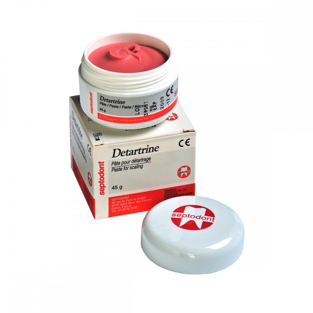 Pasta profilaxie Septodont Detartrine cu siliciu si solutie formaldehida 35 %, cu gust placut, indicata in periajul profesional, dupa detartraj mecanic sau cu ultrasunete, fara riscul abraziei smaltului, pentru inlaturarea coloratiilor determinate de fumat, in lustruirea obturatiilor, etc.